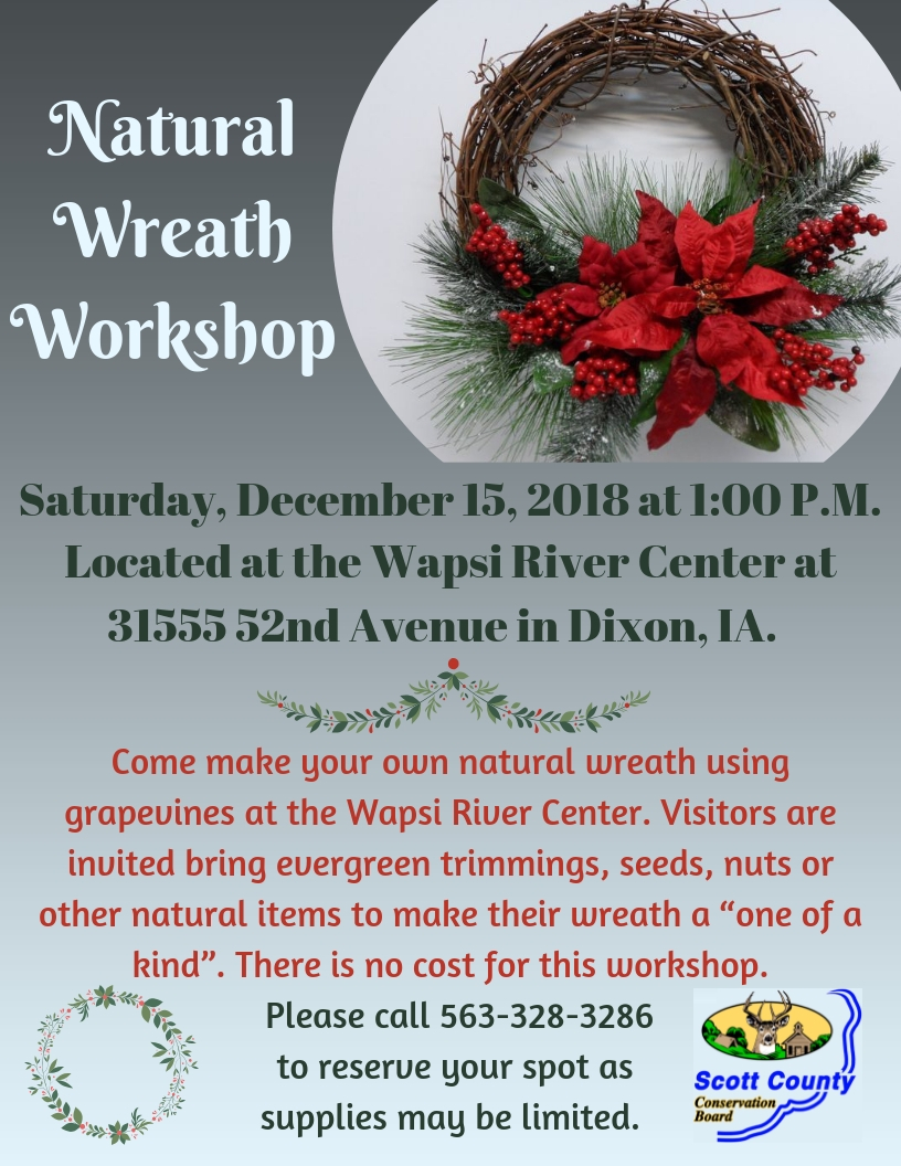 Join Naturalist, Michael J. Granger, for a lesson on wreath making. Participants will be able to fashion a wreath out of grapevine and then decorate it with natural items. Visitors may bring evergreen tree trimmings, seeds, nuts or other natural items to make their wreath a “one of a kind”. Please call 563-328-3286 to pre-register.