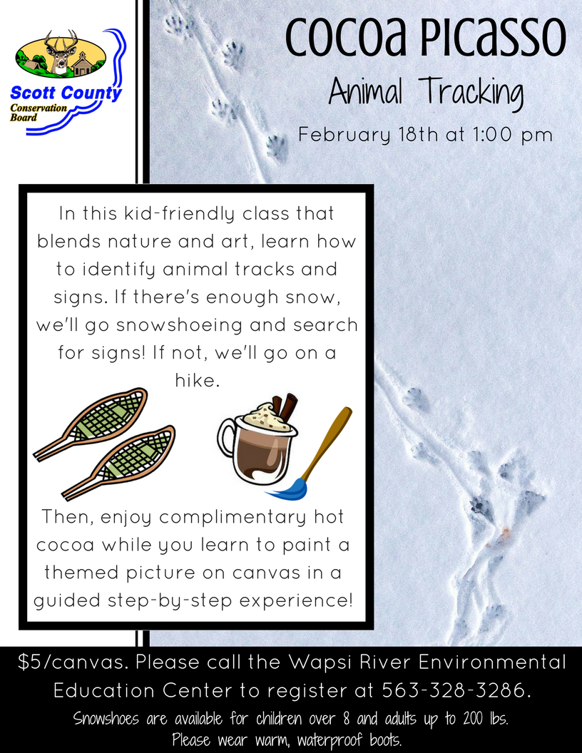 In this kid-friendly class that blends nature and art, learn how to identify animal tracks and signs. If there's enough snow, we'll go snowshoeing and search for signs! If not, we'll go on a hike. Then enjoy complimentary hot cocoa while you learn to paint a themed picture on canvas in a guided step-by-step experience!
