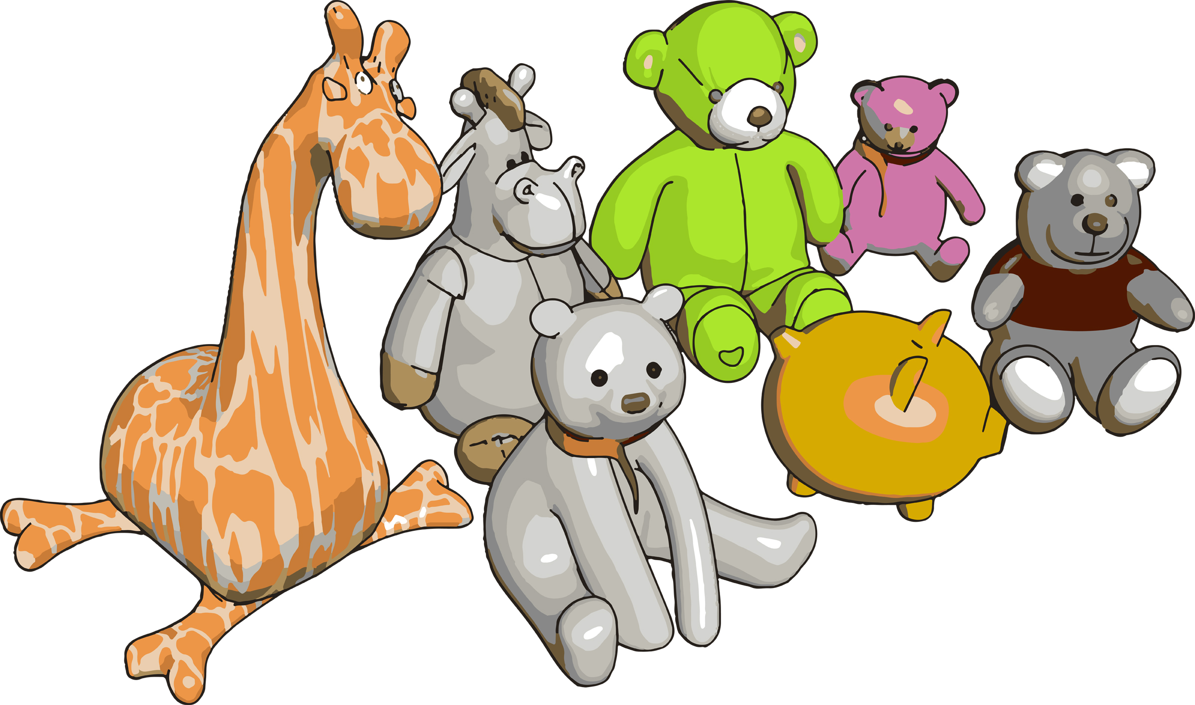 illustration of stuffed animals including giraffe, bear, rhino, and pig