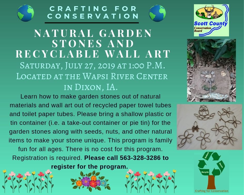 Join AmeriCorps environmental educator Faith Henrichs and Naturalist Becky Baugh for our Crafting for Conservation series. During this series we will be making arts and crafts out of either natural or recyclable items. During this session, we will be making garden stones out of natural materials and wall art out of recycled paper towel and toilet paper tubes. Please bring a shallow plastic or tin container (i.e. a take-out container or pie tin) for the garden stones. This program is family fun for all ages. Registration is required. Please call (563)328-3286 to register for this program.